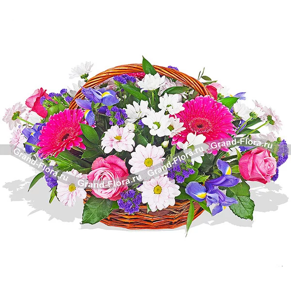 Стандартный (на фото): роза розовая - 4 шт, гербера малиновая - 3 шт, ирисы - 5 шт, хризантема кустовая светлая - 4 шт, статица - 2 шт, рускус, оазис, корзина.