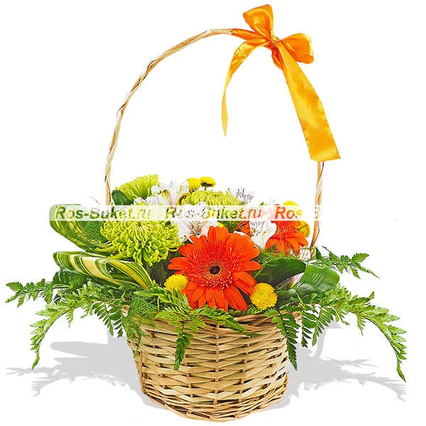 Стандартный (на фото): гербера оранжевая - 2 шт, хризантема одноголовая зеленая - 3 шт, альстромерия белая - 2 шт, хризантема кустовая желтая - 2 шт, аспарагус - 2 шт, лист аспидистры - 4 шт, папаратник - 4 шт, оазис, корзина (высокая ручка), банк оранжевый.