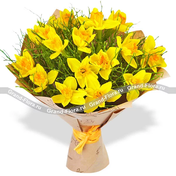 Стандартный: нарциссы желтые - 25 шт., декоративная зелень, упаковка крафт, лента.