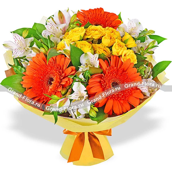 Смешанный выразительный букет из огненно-оранжевых гербер, желтых роз и нежных белых альстромерий великолепно дополнен рускусом. Яркий букет будет отличным дополнением к подарку в день рождения любимой мамы или сестры, а также выражением благодарности дорогой подруге или коллеге